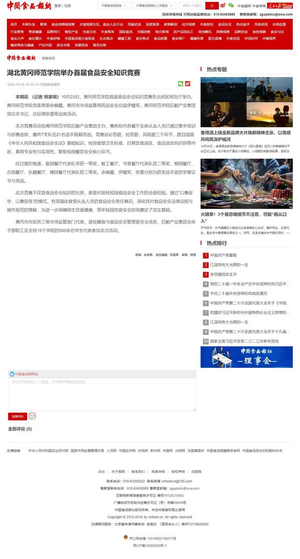 10月23日,黄冈师范学院首届食品安全知识竞赛在北校区报告厅举办。黄冈师范学院党委常委余晚霞,黄冈市市场监管局药品安全总监伊楗军,黄冈师范学院后勤产业集团党总支书记、总经理张章等出席活动。