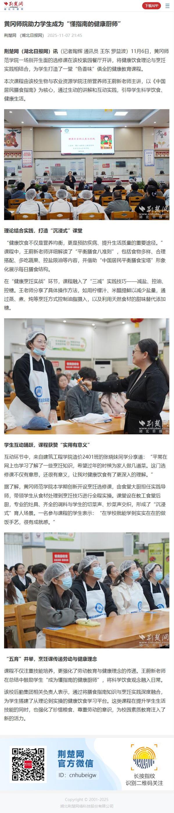 11月6日,黄冈师范学院一场别开生面的选修课在该校紫园餐厅开讲,将健康饮食理论与烹饪实践相结合,为学生打造了一堂“色香味”俱全的健康教育课程。