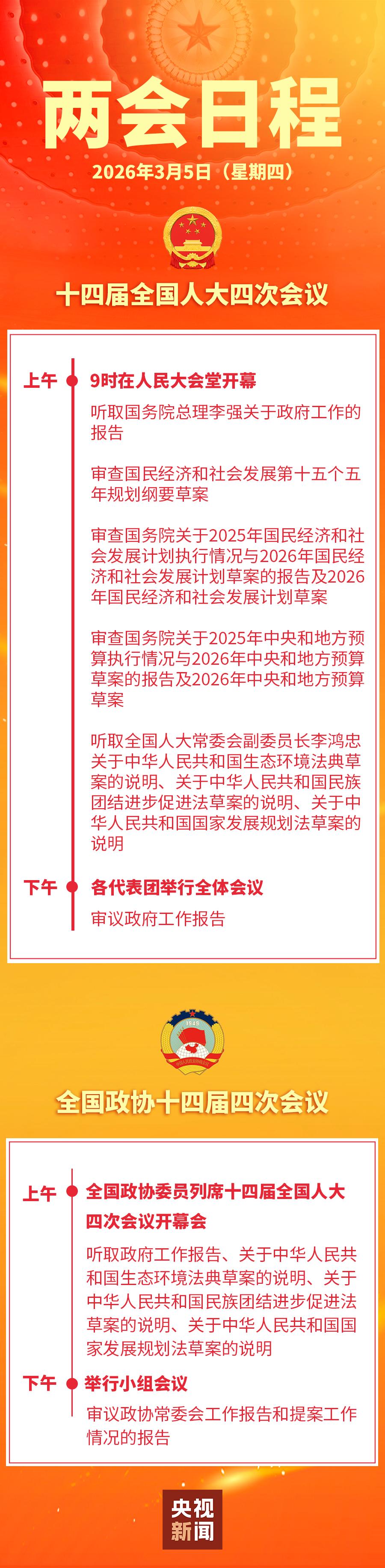 十四届全国人大四次会议5日上午9时在人民大会堂开幕,听取国务院总理李强关于政府工作的报告,审查国民经济和社会发展第十五个五年规划纲要草案,审查国务院关于2025年国民经济和社会发展计划执行情况与2026年国民经济和社会发展计划草案的报告及2026年国民经济和社会发展计划草案,审查国务院关于2025年中央和地方预算执行情况与2026年中央和地方预算草案的报告及2026年中央和地方预算草案,听取全国人大常委会副委员长李鸿忠关于中华人民共和国生态环境法典草案的说明、关于中华人民共和国民族团结进步促进法草案的说明、关于中华人民共和国国家发展规划法草案的说明。下午,各代表团举行全体会议,审议政府工作报告。