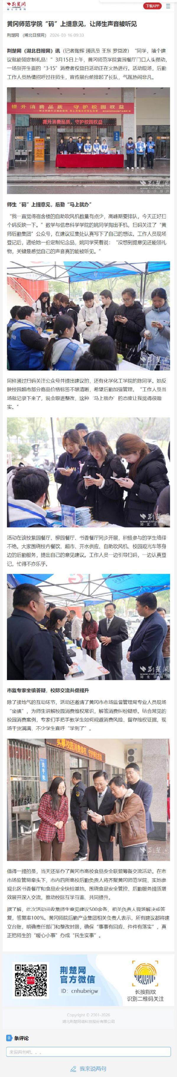 “我一直觉得宿舍楼的自助吹风机数量有点少,高峰期要排队,今天正好扫个码反映一下。”数学与信息科学学院的姚同学掏出手机,扫码关注了“黄师后勤集团”公众号,在建议征集处认真写下了自己的想法。工作人员现场登记后,递给她一份定制纪念品,姚同学笑着说:“没想到提意见还能领礼物,关键是感觉自己的声音真的能被听见。”