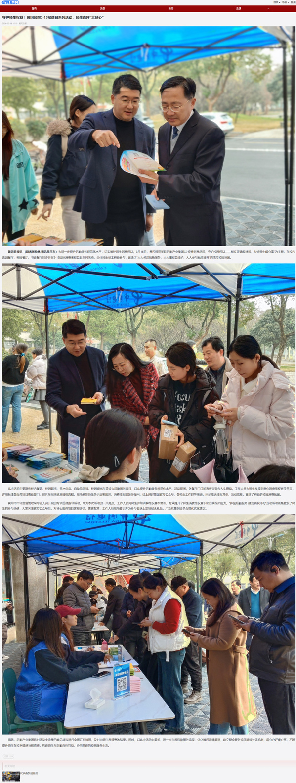为进一步提升后勤服务规范化水平,切实维护师生消费权益,3月15日,黄冈师范学院后勤产业集团以“提升消费品质,守护校园权益——树立和践行正确政绩观,用心用情办好师生实事”为主题,在校内紫园餐厅、柳园餐厅、书香餐厅同步开展3·15国际消费者权益日系列活动,全体师生员工积极参与,营造了“人人关注后勤服务、人人懂权益维护、人人参与品质提升”的浓厚校园氛围。