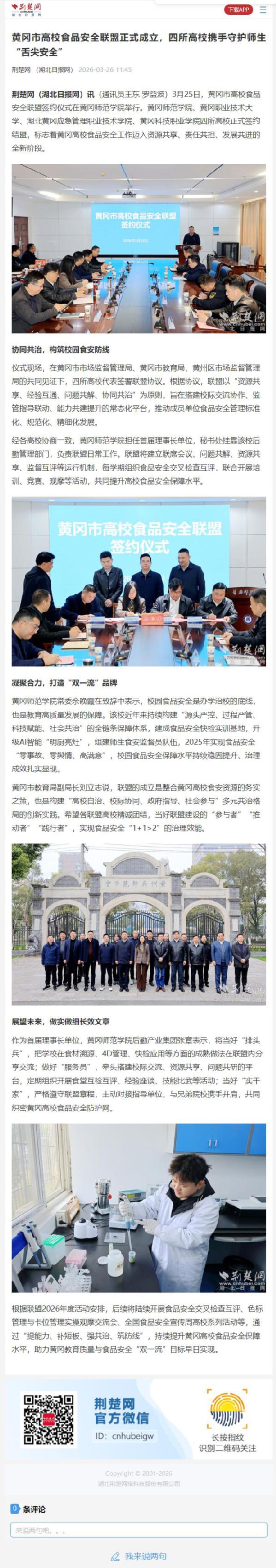 3月25日,黄冈市高校食品安全联盟签约仪式在黄冈师范学院举行。黄冈师范学院、黄冈职业技术大学、湖北黄冈应急管理职业技术学院、黄冈科技职业学院四所高校正式签约结盟,标志着黄冈高校食品安全工作迈入资源共享、责任共担、发展共进的全新阶段。